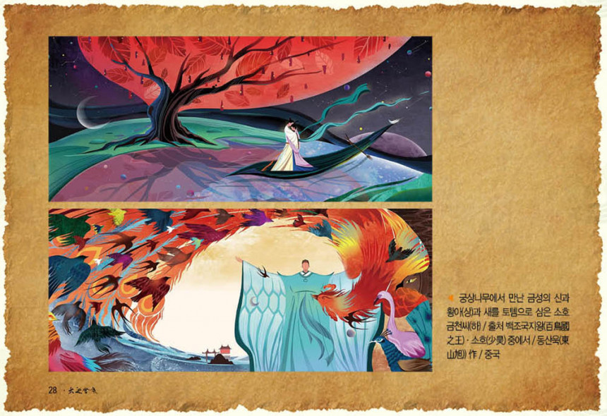 소호는 장성하여 동쪽 바다 바깥에 나라를 세우고 소호지국(少昊之國)이라 불렀다.05 그의 부족은 새를 숭상하여 이를 관직명으로 삼았다. 『춘추좌전』 「권지삼십구(卷之三十九)·소공(昭公)」에 따르면 소공 17년 가을에 담자(郯子)가 조회하니 소공이 소호가 관직의 명칭을 새의 이름으로 삼은 유래를 물었다. 이에 담자는 “자신의 선조인 소호가 즉위하자 봉황이 날아들었다. 이로 인해 소호는 새로써 법도를 정하고 이를 관직명으로 삼았다. 봉조씨(鳳鳥氏)는 역(歷)을 주관하였고 현조씨(玄鳥氏)는 춘분과 추분의 시기를 구별하는 일을 담당하며 백조씨(伯鳥氏)는 하지와 동지를 구별하는 일을 관장하였다. 청조씨(靑鳥氏)는 양기가 만물의 힘을 열어주는 일을 관장하고 저구씨(雎鳩氏)는 사마(司馬)를 관장하며 축구씨(祝鳩氏)는 사도(司徒)를 담당했다. 시구씨(鳲鳩氏)는 사공(司空)을 맡았고 상조씨(爽鳥氏)는 사구(司寇)를 관장하며 골구씨(鶻鳩氏)는 사사(司事)를 담당하였다”라고 말했다.06