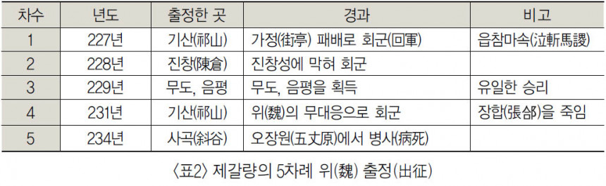 제갈량으로서는 이 패배를 수습하는 데 최선의 노력을 기울여야 했다. 정권은 안정되지 못하고 동맹은 깨어지고 많은 군사와 인재가 한순간에 사라진 위기의 순간이었던 것이다. 그는 후주(後主) 유선(劉禪)을 보좌하고 재차 오(吳)와 연합하여 위(魏)에 대항하였다. 그리고 내적으로 생산 장려와 운남(雲南) 진출을 통해 이 패배로 인한 후유증을 최소화하면서 국력 신장에 힘쓰게 된다. 이런 내적인 정비를 바탕으로 위(魏) 정벌에 나서게 되었다. 이때 그는 한실부흥의 의지를 담아 후주 유선에게 표(表)23 를 올리게 되는데 이것이 그 유명한 「출사표(出師表)」이다. 이후 그는 모두 5차례에 걸쳐 출정하게 되는데, 5차례의 원정에도 불구하고 제대로 된 성과를 보지 못하고 234년 그의 나이 54세에 오장원의 진중에서 병사(病死)하였다. 그의 원정을 표로 만들면 다음과 같다.