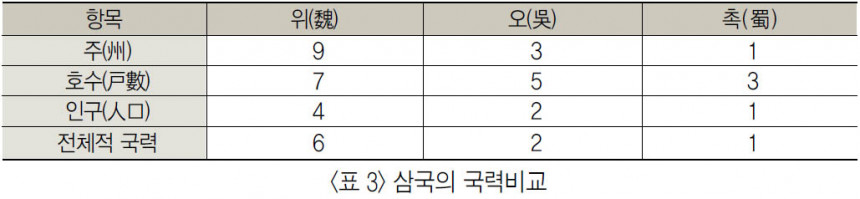 삼국의 국력을 비교한 <표3>을 보면 후한(後漢)은 13주(州)로 이루어져 있었는데 위(魏)는 그 대부분이라고 할 9개 주를 오(吳)는 3개 주, 촉(蜀)은 익주(益州) 하나를 차지하고 있을 뿐이다. 그리고 호수(戶數)와 인구(人口)에 있어서도 절대적인 열세였는데 당시의 호수와 인구로 판정한 국력을 대비해 보면 촉(蜀)의 국력을 1로 볼 때 오(吳)는 2, 위(魏)는 6으로25 애초에 삼국이라는 개념 설정에 문제가 있지 않은가 생각할 수 있을 정도이기 때문이다.